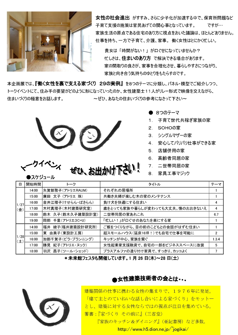 〈トークイベントスケジュール〉 「それぞれの居場所」 「負け犬を快適にする住まい」 「歳をとっても、家族や暮らしが変わっても大丈夫。懐の大きな家」 「二世帯同居の家あれこれ」 「忙しい!が口ぐせのあなたを楽にする家」 「超スモールハウス(延床16坪)でも、自宅で仕事を可能に」 「キッチンが中心、家族を繋ぐ」 「女性企業家支援融資で、自宅の一部をビジネススペースに改装」 「プラスアルファの造付家具で、すっきり、カッコよく」